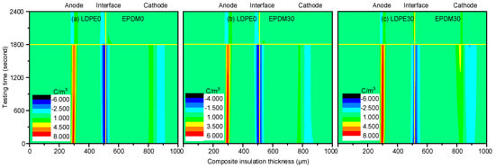 Space charge distribution during the polarization and depolarization processes. (a) LDPE0/EPDM0; (b) LDPE0/EPDM30; and (c) LDPE30/EPDM30.