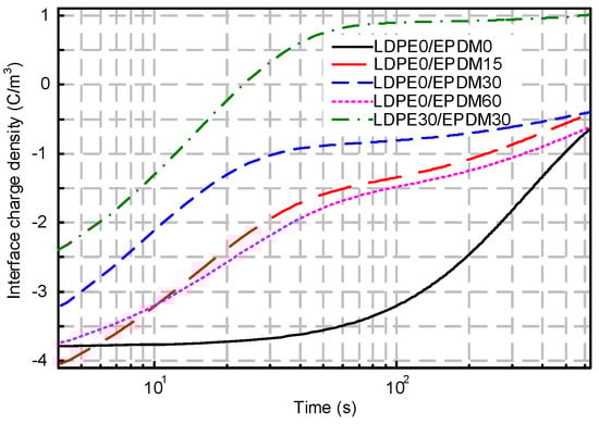 Figure 7 illustrates the space charge distribution of the LDPE/EPDM composite insulation. The interface charge polarity is negative, as it is when the voltage is applied to the EPDM. In Figure 7a, a large number of charges accumulate at the interface with a density of 7.55 C/m3, due to 1800 s of stressing. Figure 7b shows the dynamic space charge behaviors of the 30 min fluorinated EPDM composed bilayer insulation system. Compared with the non-fluorinated EPDM samples, the interfacial charge density is decreased to 3.65 C/m3. This level of fluorine produces sufficient inhibition of the interface charge accumulation. Figure 7c demonstrates the depolarization and polarization processes of both of the fluorinated samples (LDPE30/EPDM30). For this group of samples, the interface charge density first increases and then decreases, which is caused by the slow release of the quick polarized dipoles in the fluorinated polymers. At the same time, more heterogeneous charge is injected from the cathode.