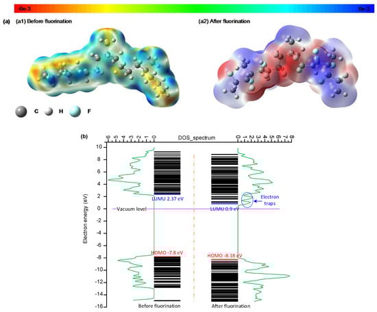 According to the above results, the space charge accumulation on the sample surface and at the interface is significantly suppressed in the 30 min fluorinated EPDM samples, due to the increased proportion of shallow traps. It is believed that the trap distribution in the polymer surface layer is significantly correlated with the electrostatic potential upon fluorination treatment. Figure 9a shows the 3D electrostatic potential distribution in the EPDM surface layer before and after fluorination. The third monomer, ethylidene norbornene (ENB), is not included in the EPDM model, given its very low contents in the unit molecular chain (4.6%). In the 3D electrostatic potential distribution, the warm color shows the negatively charged region, and the cold color shows the positively charged region. As the electronegativity values between the carbon of the main chain and the hydrogen of the side chain are different, the orbital electron is biased in the EPDM. The carbon of the main chain and the hydrogen of the side chain are respectively negatively and positively charged in the EPDM, as shown in Figure 9(a1). For the EPDM samples after fluorination, the colors of both the warm and cold regions deepen, which means that the electrons and holes are easily captured by the cage skeleton.