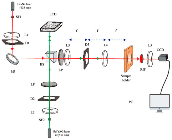To record and evaluate the DOEs in the NPC material, we used the setup shown in Figure 4, which consisted of two beams. The recording green beam was formed using a solid-state laser (model Verdi Nd:YVO4, Coherent, CA, USA), operating at a wavelength of 532 nm (green light). The DOE pattern was introduced by the LCoS spatial light modulator (SLM), which was located on the recording arm. Amplitude modulation was produced using the two polarizers (LPs) placed on both sides of the device. Then, to image the intensity distribution generated by the SLM onto the recording material, we used a 4f system, which gives direct access to the Fourier plane. Two identical lenses (L3, L4) had a common focal point, where a diaphragm (D3) was placed. Thus, the distance between input plane and image plane was 4 times the length of f [29]. We measured DEs in real time, defined as: