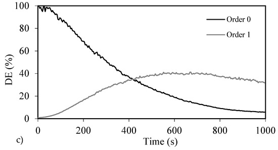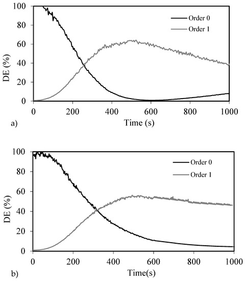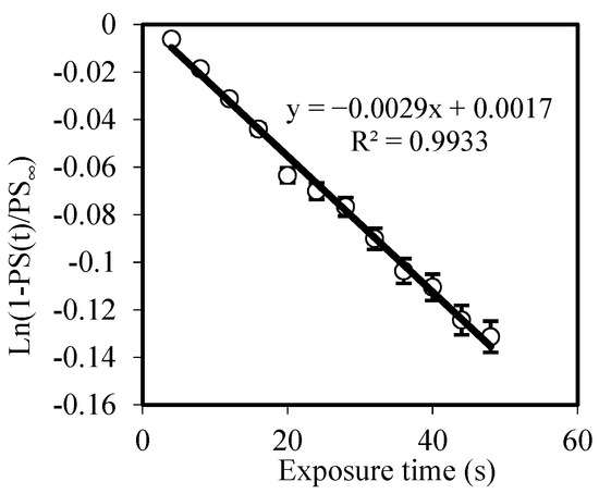 where PS is the phase shift, is the phase shift for long times when the grating becomes stable, D is “apparent” diffusion, and Λ represents the grating period. In this case, after recording, the DE of the zero and first order remained practically constant. Figure 5a shows the post-exposure evolution of the material after 50, 100, 150, 350, and 400 s of exposure. The fitting for the grating, stopped after 150 s of exposure time to obtain the diffusivity value, and is shown in Figure 6. The diffusivity values measured were (2 ± 1) × 10−9 cm2/s, which are higher than those measured for the PVA/samples with index matching system [21], but much lower when compared with samples without the index matching system, in which values around 1−8 cm2/s were obtained [21,31]. As the experiments were conducted several times, the error estimated (±1 × 10−9 cm2/s) was due to the repeatability and the existing ambiguity when determining the .
