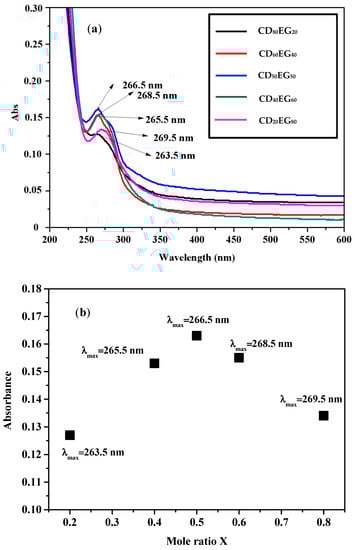 As observed in Figure 1a, the absorption maximum for different CD-EG complexes varied with respect with the mole ratio X of feedings of CD and EG. The result demonstrated the influence of β-CD to the absorption peak of EG. In other words, these results revealed that various ratios of β-cyclodextrin interacted with EG lead to the shifting of maximum adsorption wavelength of complexes compared to original EG (274 nm) []. In particular, the maximum adsorption wavelength shifted from the original wavelength of EG (274 nm) to 269.5, 268.5, 266.5, 265.5, and 263.5 nm corresponding to EG80CD20, EG60CD40, EG50CD50, EG40CD40, and EG20CD20, respectively. From those UV–Vis results, it demonstrated that EG can interact with β-CD to form the inclusion complexes.