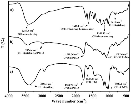 To demonstrate the entrapment of PLGA polymer on CD-EG complexes, the prepared samples were tested by FTIR to determine functional groups of compounds existing in the samples. The result in Figure 2 shows the FTIR spectrum of pure EG, PLGA-EG, and PLGA-CD-EG samples. For the FTIR spectrum of EG (Figure 2a), the appearance of typical adsorption peaks was demonstrated for specific functional groups of EG. In particular, the adsorption band at 3357.5 cm−1 indicated OH groups linked to aromatic rings. Moreover, specific peaks at 1616.1, 1141.06, and 821.5 cm−1 demonstrated C=O groups connected to the trihydroxy benzoate ring, OH groups linked to the chromane ring, and C–H stretching, respectively []. For the FTIR spectrum of PLGA-EG (Figure 2b), the results showed that there were new typical peaks that revealed the representation of the PLGA polymer in PLGA-EG. In detail, some new specific adsorption bands appeared at 2954.4, 1758.76, and 1087.6 cm−1, indicating C-H stretching, C=O groups, and C–O stretching, respectively []. In addition, some typical peaks of EG also appeared in the spectrum. The results proved that PLGA-EG components included PLGA and EG. For the FTIR spectrum of PLGA-CD-EG (Figure 2c), the result also revealed typical peaks of PLGA and EG. Apart from that, there were some specific adsorption bands describing for the existence of β-CD. For examples, the absorption peaks at 3386.4 and 1029.2 cm−1 indicated for β-CD []. In short, the FTIR spectrum revealed the functional groups of each component in PLGA-CD-EG.