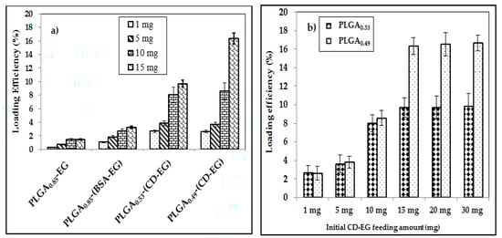 Compared with PLGA microspheres containing BSA, PLGA0.49-(CD-EG) and PLGA0.53-(CD-EG) had loading efficiencies of 2.68–16.34% and 2.64–9.69% (Figure 3b), displaying the role of β-CD in the dissolution of EG in PLGA microspheres. This is due to the chemical structure of β-CD with hydrophilic and hydrophobic phases in the outer and inner surfaces []. Therefore, β-CD could function as an interface between EG and PLGA through hydrophilic and hydrophobic interactions.