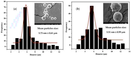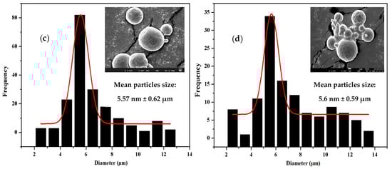 To determine the particle size and distribution of PLGA microspheres before and after CD-EG loading, various formulations of PLGA microspheres were investigated by SEM. Figure 4 shows the average particle size and distribution of microspheres determined by Image J software. As seen, the average particle sizes of PLGA0.49-(CD-EG)0 (Figure 4a), PLGA0.53-(CD-EG)15 (Figure 4b), PLGA0.49-(CD-EG)15 (Figure 4c), and PLGA0.85-EG15 (Figure 4d) were 5.73 ± 0.61, 5.51 ± 0.99, 5.57 ± 0.62, and 5.6 ± 0.59 µm, respectively. These results proved that the average particle size of PLGA microspheres was insignificantly changed. Therefore, it can be concluded that CD-EG did not influence to morphology and average particle size of PLGA microspheres. In addition, the results in Figure 4 also revealed that the distribution of particle sizes of PLGA0.49-(CD-EG)0, PLGA0.85-EG15, PLGA0.53-(CD-EG)15, and PLGA0.49-(CD-EG)15 all ranged from 1–14 µm. These results demonstrated that PLGA micro-particles still distributed well after CD-EG loading.