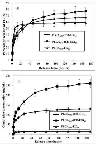 The release of EG from PLGA microspheres loaded with/without CD-EG complexes were experimented in PBS solution (pH 7.4) incubated at 37 °C. The results are shown in Figure 5. The percentage release of EG from PLGA0.85-EG15, PLGA0.53-(CD-EG)15, and PLGA0.49-(CD-EG)15 versus the release time is illustrated in Figure 5a, and the cumulative amount of released EG is shown in Figure 5b.