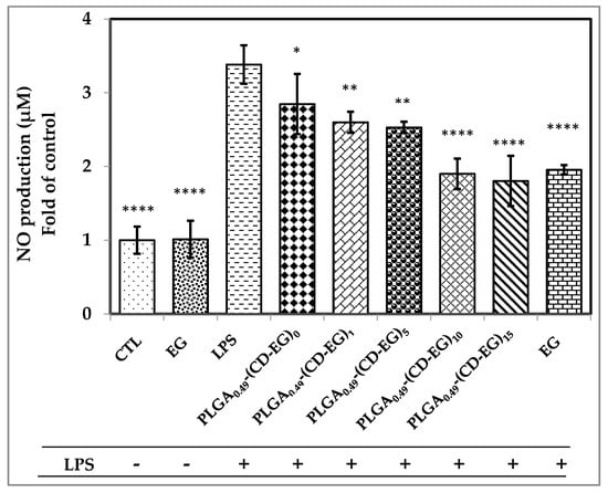 Effects of PLGA0.49-(CD-EG) formulations on NO production by BV-2 microglial cells in the presence or absence of 50 ng/mL of LPS by Griess reagent method. CTL is the control without the addition of EG and LPS. As compared to LPS, the marks of statistical significant *, **, *** and **** represent p < 0.05, 0.01, 0.001, and 0.0001, respectively.