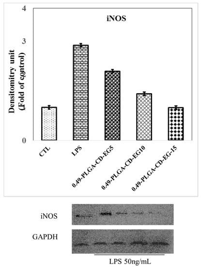 Effects of PLGA0.49-(CD-EG) formulations (1 mg/mL) on the expression of iNOS in BV-2 cells treated with 50 ng/mL of LPS for 24 h. Cultures were pretreated with PLGA0.49-(CD-EG) for 24 h before the the addition of LPS. Bars represent the mean ± standard errors from three independent experiments. Densitometry analyses are presented as the relative ratio of protein/GADPH protein and are represented as fold changes with respect to the control.