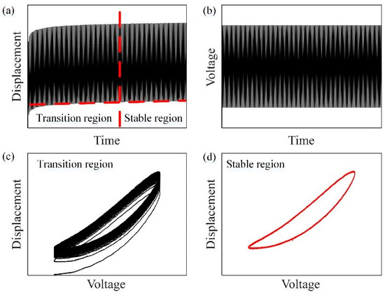 Despite the diverse achievements in mechanism design, there still remains a challenge to accurately characterize the response of DEAs because of their inherent viscoelasticity. Figure 1a illustrates an experimental response of a DEA under a sinusoidal exciting input (Figure 1b). From the results, we can observe that the response can be divided into two regions: a transition region and a stable region. In the transition region, the output displacement creeps over extended periods of time, as shown in Figure 1c, where the displacement decreases over time and becomes less dominant after a few cycles [11]. Many well-defined models [12,13,14] have been developed to describe this viscoelastic creep effect. It should be noted that, even without a creep model [15], a conventional feedback controller can easily mitigate such creep effect. On the other hand, viscoelastic hysteresis effect dominates the response of DEAs during the stable region (Figure 1d). Hysteresis is a non-smooth nonlinearity with multivalued and nonlocal memoryless behavior [16,17]. It can significantly degrade the performance of actuators, which leads, in the best case, to a reduction in the motion accuracy and, in the worst case, to destabilization of the control system [18,19,20,21,22]. By measuring the relationship between displacement, force, and input voltage, York et al. [23] recently pointed out that the hysteresis mainly causes positioning inaccuracy of DEAs. Therefore, it is important and necessary to understand and characterize the hysteretic nonlinearity of DEAs.