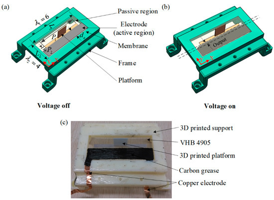 In this work, a planar DEA as shown in Figure 2a was fabricated for proof-of-concept examining. The fabrication processes can be summarized as follows: (i) A prestrained DE membrane (3M VHB 4905, , ) is supported by a 3D printed frame. (ii) A platform () is fixed on the middle of the DE membrane to separate the DE membrane into passive and active regions. (iii) Carbon grease is used as electrodes covering both sides of the active region (the right part of the DE membrane). It should be noted that in order to avoid electric break down, there is an interval of 1 mm between the electrodes and the edges of other parts, such that each electrode is a rectangular area with a length of 98 mm and a width of 15.5 mm. (iv) The electrodes are connected to a high-voltage source.