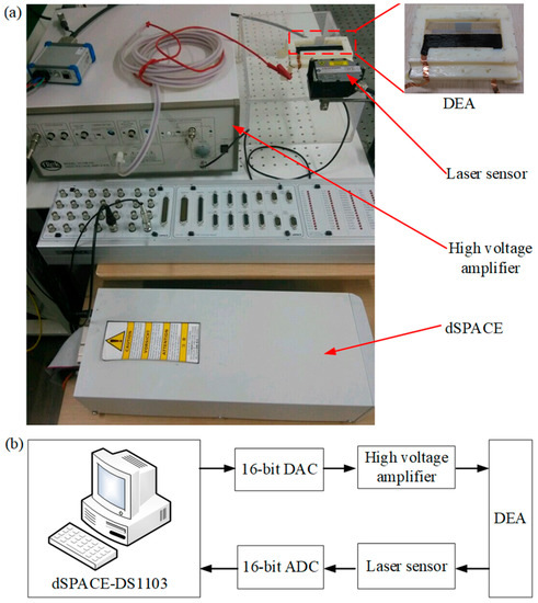 In order to capture and characterize the viscoelastic hysteresis effect of the planar DEA, we built an experimental setup as shown in Figure 3a. A high-voltage amplifier (TREK 10/10-HS, TREK INC., New York, NY, USA) with a fixed gain of 60 dB was used to apply an exciting voltage for the planar DEA, and a laser sensor (Micro-Epsilon ILD2300-100, range of 0–100 mm with an analogue output of 0–10 V, Micro-Epsilon, Ortenburg, Germany) was utilized to measure the output displacement of the planar DEA. A dSPACE-DS1103 (dsPACE, Paderborn, Germany) board equipped with 16-bit analogue-to-digital converters (ADCs) was adopted to generate a control signal for the high-voltage amplifier and to capture the output signal of the laser sensor. In this work, the sampling time was set to be 1 ms. Figure 3b gives a block diagram of the experimental setup. It should be noted that when the amplitude of the exciting voltage was higher than 3 kV, we could observe several failure phenomena, such as instability and wrinkling [2]. On the other hand, the output displacement of the planar DEA was too small to be observed when the exciting voltage was lower than 0.5 kV. Therefore, we kept the exciting voltage in the range of 0.5–2.5 kV in the study.