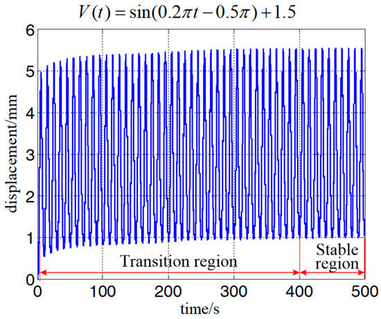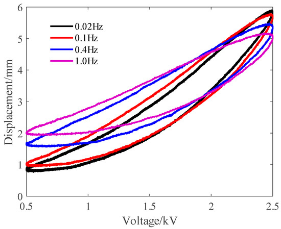 Figure 4 shows the experimental results when the frequency of the exciting voltage equaled 0.1 Hz. As mentioned in Figure 1, the displacement could be separated into a transition region and stable region. During the transition region, a creep effect (slow drift of the displacement [14]) was observed and lasted about 400 s before reaching the stable region. It should be noted that although such creep is caused by viscoelasticity of the DEA, it has been explained by many well-defined models [12,13,14]. Differently from the transition region, the viscoelastic hysteresis effect dominates the dynamical response in the stable region. However, how to model the viscoelastic hysteresis effect of DEAs is still challenging. Therefore, we were motivated to establish a MRPIM to describe the viscoelastic hysteresis effect of DEAs. To avoid the influence of the creep effect, we only took the experimental data of the stable region into consideration for developing the MRPIM. To further analyze the features of the viscoelastic hysteresis effect of the planar DEA, we compared the viscoelastic hysteresis loops with different frequencies (0.02, 0.1, 0.4, and 1 Hz). On the basis of the experimental results shown in Figure 5, we could observe the following: