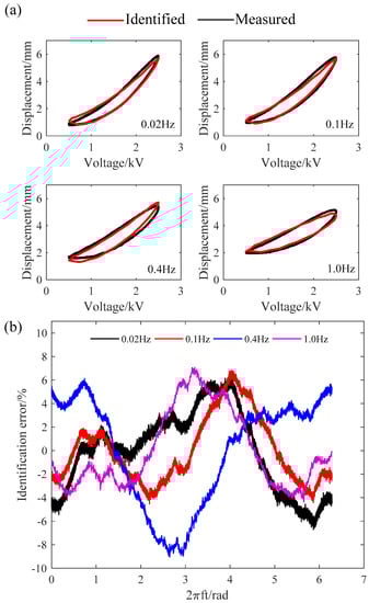 Figure 6a shows the comparisons between the experimental data (black lines) and the identified results (red lines). The identification errors are plotted in Figure 6b. We can see from Figure 6 that the identified MRPIM could accurately describe the hysteresis loops under different frequencies.