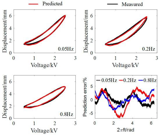 To further verify the effectiveness of the MRPIM, we used it to predict the viscoelastic hysteresis effect of the planar DEA with three different frequencies (0.05, 0.2, and 0.8 Hz) and compared the predicted results with experimental data. Figure 7 and Table 4 demonstrate that the MRPIM agreed well with the experimental data. The maximum prediction error and the root-mean-square prediction error were 6.95% and 3.25%, respectively. Therefore, the MRPIM can precisely describe the viscoelastic hysteresis effect of the planar DEA when the frequency of the exciting voltage is in the range of 0.02–1 Hz.