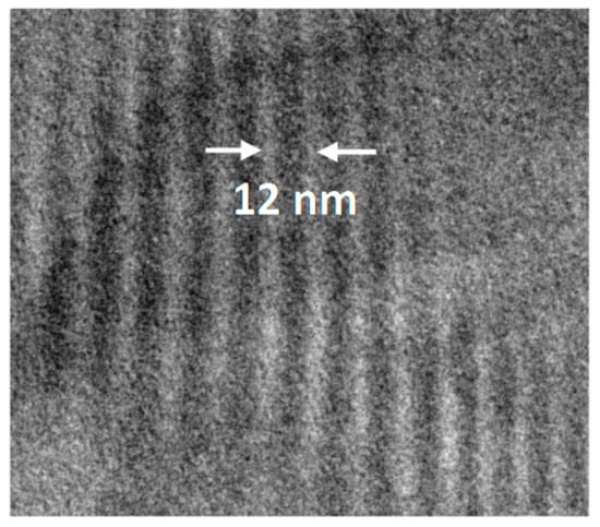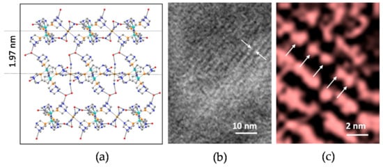 X-ray data gives insights into the molecular organization of the polymer chains, as shown for the Ru-Au system in Figure 2a [8]. Polymeric units spread along chains and are held together in a 3D structure by electrostatic and hydrogen bond interactions. Polymer chains interact with adjacent chains, self-organizing into parallel plane stacks separated by a distance of 1.972 nm. Hydrogen bonds connect the polymeric chains via PTA nitrogen with structural water molecules bridged through the hydrogen bonds. Transmission Electron Microscopy (TEM) (JEOL, Akishima, Japan) allows the visualization of the mesoscopic structure. Water-dissolved Ru-Au polymer was deposited on Fomvart and dried at 40 °C for 12 h before sample observation. Regular stripes in Figure 2b with gaps of about 2 nm correspond to the polymer rows, consistently with the X-ray information. Figure 2c zooms local details from the picture and shows single units in a row, which corresponds to the monomer units, separated by a distance of about 2 nm.