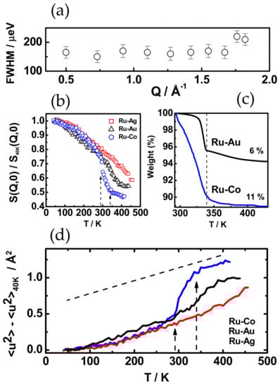 (a) Q-independence plot confirms little structural contribution to the signal for Ru-Au; (b) Normalized elastic scattering intensity for Ru-Ag, Ru-Au and Ru-Co; (c) Thermo-gravimetric curves taken at 2 °C/min heating rate. Mass loss corresponds to about 6% for Ru-Au and 11% for Ru-Co; (d) Mean square displacement <u2> calculated for the tree polymers.