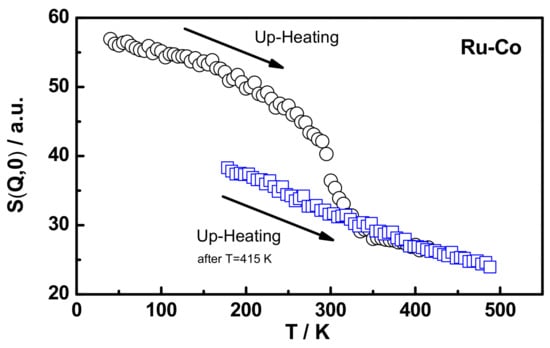 In order to gain more insight into the relaxations, thermo-gravimetric experiments were carried out for the systems Ru-Au and Ru-Co. Figure 3c shows a loss of material for both systems at 280 K, the temperature that triggers the polymer relaxation. The weight loss rate moderates at ~340 K, just at the point where, especially for the Ru-Co, the mean-square displacement changes its trend again. Lost weight corresponds to 11% and 6% for Ru-Co and Ru-Au, respectively, coinciding with the amount of structural water calculated from X-ray. The structural water links the polymer chains through hydrogen bounds, keeping rigid the polymer structure. As temperature increases, these bonds break, and the structural water is released. This fact provokes the observed increase of polymer dynamics. The release of water molecules generates vacancies within the polymer structure that could allow their substitution by molecules with similar size. To check that the final structure is water-free, we cooled the Ru-Co sample down back to 170 K, equilibrated and reheated, as shown in Figure 4. The temperature required for eliminating the water from the solid structure of the complexes is determined by the hydrogen bond strength among water molecules and the polymer. This, in turn, is related to the hydrogen bond distance. For Ru-Ag, the shortest distance between two H atoms at adjacent polymer chains mediated by a water molecule is 2.699 Å [7]. This distance is longer than that corresponding to strong hydrogen bonds, but shorter than the sum of the van der Waals radii [22]. The above-mentioned distance is 2.723 Å for Ru-Au and 2.817 Å for Ru-Co [5]. Taking into account these distances, the temperature required to release the structural water should increase following the series Co-Au-Ag, as experimentally observed in Figure 3.