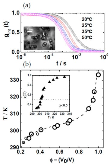 (a) Intensity autocorrelation function for the colloidal particles at different temperatures. Inset: Optical microscopy of Ru-Au polymer microparticles; (b) Phase diagram for the Ru-Au colloidal particles. The dashed line is a guide to the eye. Inset: Flory’s solvency function, χ(T).