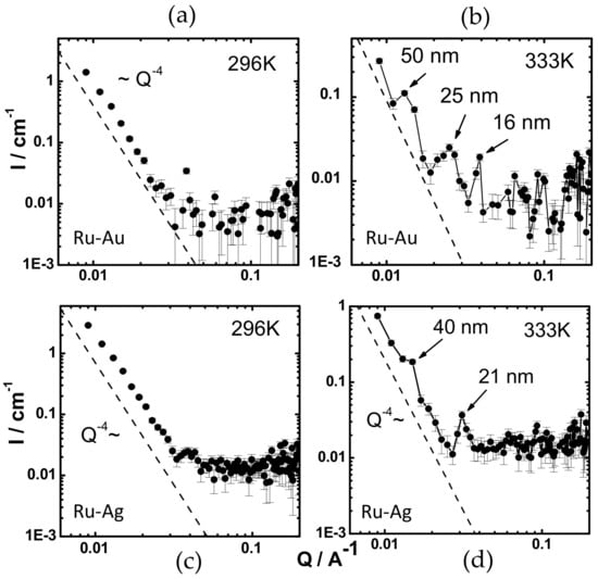 Small-angle neutron scattering is used to investigate the internal structure of the polymer network along the swelling [25,26]. The neutron scattered intensity I(Q) is obtained at a wave-vector transfer Q = (4π/λ)sin(θ/2). I(Q) in absolute scale is given by I(Q) = Iobs(Q) + Iinc(Q), where Iobs(Q) and Iinc(Q) are the observed and the incoherent scattered intensities, respectively. SANS intensities are plotted in Figure 6 for Ru-Au and Ru-Ag polymers dispersed in D2O. Spectra correspond to swollen (296.15 K) and collapsed (333.15 K) particles. The measured scattering intensity decreases monotonously with Q for swollen particles, well described by a −4 exponent power law. For colloids, the particle form factor P(Q) contributes significantly to the scattering intensity. The Porod contribution to P(Q), arising from the particle surface, dominates the scattering profile leading to I(Q) ~ Q−4, as experimentally found.
