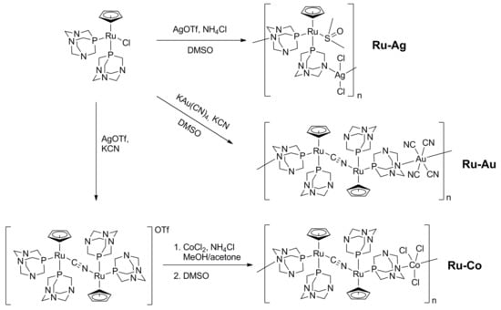 The organometallic polymers {[(PTA)2CpRuDMSO-μ-AgCl2-]}n (Ru-Ag) and [{RuCp(PTA)2-μ-CN-1κC:2κ2N-RuCp(PTA)2}-μ-Au(CN)4]n (Ru-Au) are obtained by reacting [CpRuCl(PTA)2] with AgCl or [Au(CN)4]−, in each case, in DMSO containing water (Scheme 1). The polymer cis-{[{RuCp(PTA)2-μ-CN-1κC:2κ2N-RuCp(PTA)2}-μ-CoCl3]}n·{[RuCp(PTA)2-μ-CN-1κC:2κ2N-RuCp(PTA)2]Cl}0.5n·(15H2O)n (Ru-Co) is prepared from reaction of the dimeric ruthenium complex [RuCp(PTA)2-μ-CN-1κC:2κ2N-RuCp(PTA)2](CF3SO3) with CoCl2 in DMSO:H2O (10:1 volume). The polymer crystallization of them provides single crystals for X-ray determination.