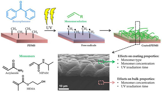 Easy coating approaches have been developed for hydrogel coatings, which offer interesting possibilities as they are easy to functionalize, adaptive and deformable, and can be made responsive towards external stimuli [30,31]. Moreover, surface-attached hydrogel coatings are very easy to fabricate and can be implemented under various conditions. Further, the resulting hydrogel layer is stable under many conditions [32]. An approach to create hydrogel coatings on a PDMS surface is via UV-mediated free radical polymerization using benzophenone (BP). A large surface area is readily modified by photo-initiated polymerization because these reactions can be performed under mild experimental conditions [33]. In particular, UV-mediated photo-grafting using benzophenone is a well-established procedure that does not require special surface functionalization before polymerization, other than the infusion of PDMS with benzophenone [34,35]. UV-excitation is used to create surface-bound free radicals as benzophenone excited and by proton abstraction, creates a methyl-radical [36], thereby initiating the free-radical reaction where the surface confined methyl radicals react with the monomers ((meth)acrylates) present in solution [37,38]. This approach is used for different applications within coloring, medical coatings, and adhesives [39,40,41]. However, neither the bulk properties of PDMS after applying these coatings nor the effect of possible changes in these bulk properties on optimum coating properties were considered previously.