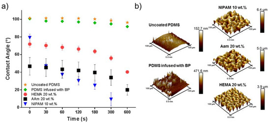 (a) Contact angle measurements as a function of time and (b) surface morphology images captured by AFM of an uncoated PDMS surface; PDMS infused with benzophenone (BP); and PDMS surface coated with N-Isopropylacrylamide (NIPAM) 10 wt %, 2-Hydroxyethyl methacrylate (HEMA) 20 wt %, and acrylamide (AAm) 20 wt % (UV irradiation time is 10 min).
