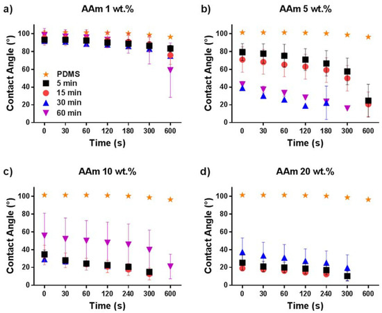 Contact angle measurements of PDMS surfaces coated with different concentrations of acrylamide and with various UV irradiation times: (a) AAm 1 wt %, (b) AAm 5 wt %, (c) AAm 10 wt % and (d) AAm 20 wt %.