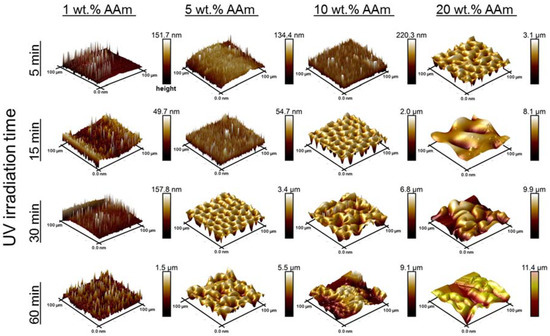 Surface morphology images captured by AFM of representative PDMS surfaces coated with different concentrations of acrylamide and with various UV irradiation times: AAm 1 wt %, AAm 5 wt %, AAm 10 wt %, and AAm 20 wt %. Areas analyzed are 100 µm × 100 µm.