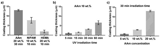 3.1. Monomer Type, Concentration, and UV-Irradiation Time Affect Coating Characteristics