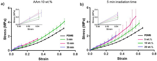 Stress-strain diagram of (a) PDMS and PDMS coated with 10 wt % acrylamide irradiated for different UV radiation time, (b) PDMS and PDMS coated with acrylamide of different concentrations after 5 min UV radiation.