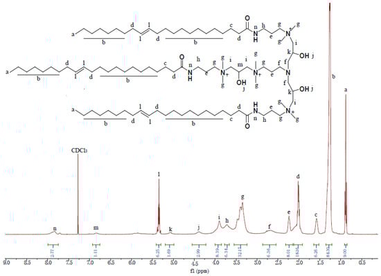 Figure 2 is about the 1H NMR (400 MHz, CDCl3) for VES-T: 0.88 (t, 9H, CH3), 1.26 (m, 84H, CH2), 1.58 (s, 6H, COCCH2), 2.03–1.98 (m, 18H, C=CCH2, COCH2), 2.23 (m, 8H, N+CCH2), 2.70 (s, 6H, NCH2), 3.47–3.35 (m, 32H, N+CH3, N+CH2), 3.72 (s, 6H, CONCH2), 3.90 (s, 8H, CN+CH2), 4.39 (s, 3H, COH), 5.07 (s, 2H, N+CCH), 5.38–5.30 (m, 6H, HC=CH), 6.83 (s, 1H, N+CCH), 7.83 (m, 3H, CONH). Thus, the desired product VES-T was successfully synthesized.