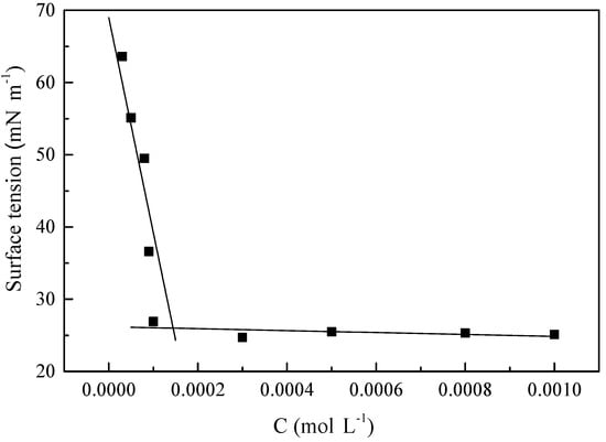 As mentioned earlier, the surface tension of VES-T was measured at 25 °C using a KRUSS DSA30S tensiometer. The measurement process continued until the surface tension value obtained was almost constant. Shown in Figure 3 is the variation of surface tension versus the concentration of VES-T. The variation tendency of surface tension could be described with two straight lines. The surface tension decreases with the increasing concentration of VES-T, and then reaches a clear inflection point, where the intersection of the two lines is the CMC. The surface tension at CMC is recorded as γCMC.