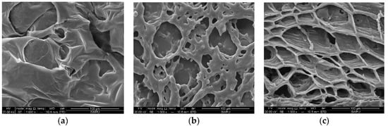 For this reason, the SEM measurements of the VES-T fracturing fluids without any counter-ion, with NaSal and KCl were conducted using a Quanta 450 scanning SEM (FEI, Hillsboro, OR, USA), respectively. The results are shown in Figure 4a–c. Compared with Figure 4a, b and c both show cross-linked networks composed of entangled wormlike micelles. This result confirms that the presences of counter-ions (NaSal and KCl) greatly assist the formation of 3D networks, and the shielding effects by overhead counter-ions are remarkable. The viscoelastic and rheological characters of the VES-T fracturing fluid can be explained as the formation of the 3D network.