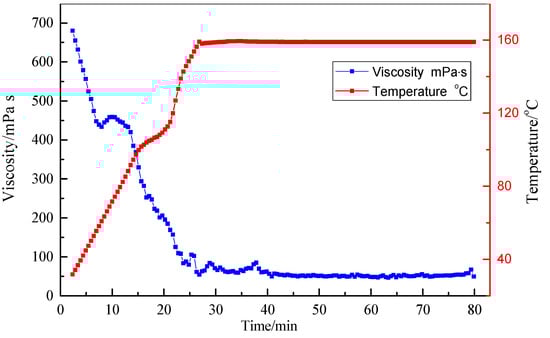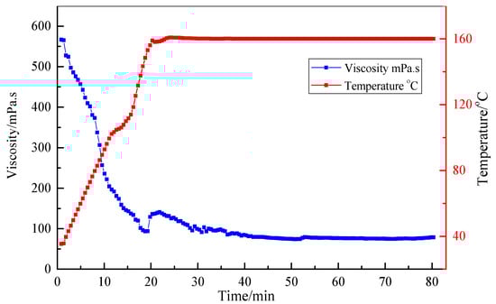 Both KCl and NaSal have significant effects on the formation of entangled wormlike micelles according to the SEM morphologies of Figure 4a–c. For the purpose of investigating the influence of the counter-ions on the macroscopic rheological properties of the VES-T fluids, the thermal-stability tests for the VES-T fluids with KCl and NaSal were performed at 160 °C and at the constant shear rate of 170 s−1 for 80 min. The results are shown in Figure 5 and Figure 6. As depicted in Figure 5, the viscosity of the solution prepared with 5 wt % VES-T and 1.4 wt % KCl first decreases to 433 mPa·s, and then increases to 458 mPa·s. Subsequently, the viscosity decreases again and finally maintains at about 50 mPa·s. Similarly, for a solution consisting of 5 wt % VES-T and 1.2 wt % NaSal, the viscosity of fluid decreases sharply with the increase of testing temperature, and then maintains at about 78 mPa·s. The results indicate that NaSal has a superior performance in enhancing the thermal stability of the system compared with KCl.