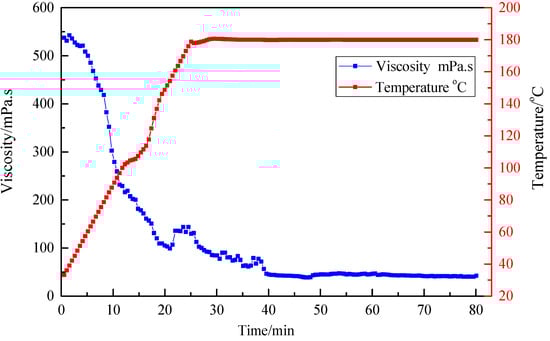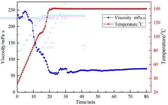 To reduce the cost, the concentration of VES-T was reduced to 3 wt %, and the rheological property of the system was evaluated at 140 °C. As shown in Figure 8, the viscosity of the 3 wt % VES-T/1 wt % NaSal solution remains at 70 mPa·s, which could meet the viscosity requirement (>25 mPa·s) for VES fracturing fluid according to industry standard. The thermal-stability testing results demonstrate that the VES-T fracturing fluids with the above formula could have good performance in the development of reservoirs under ultra-high temperature.