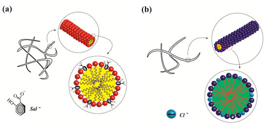 Figure 9. (a) Schematic diagram for Sal to affect micelle shape transition; (b) Schematic diagram for Cl to affect micelle shape transition.