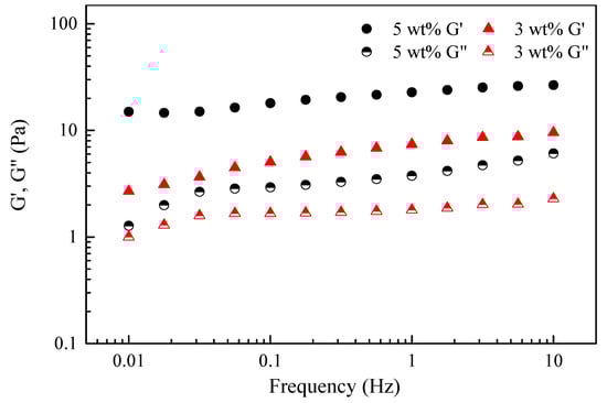 Figure 10. Storage modulus G′ and loss modulus G″ varying as a function of frequency for the two (3 wt % and 5 wt %) VES-T samples at 25 °C. G′ is greater than G″ throughout the test in both the two samples. G′ and G″ of the 5 wt % VES-T sample are greater than that of the 3 wt % VES-T sample.