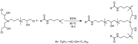 Ethanol (50 mL) and N,N′-dimethyl-1,3-propanediamine (6.13 g, 0.06 mol) were added into a round-bottom flask. Epichlorohydrin (27.76 g, 0.3 mol) was then added dropwise to this stirring mixture at 25 °C. Subsequently, concentrated hydrochloric acid (HCl) (6 g, 0.06 mol) was added to provide hydrogen atoms for this reaction. Then, the mixture was stirred vigorously under reflux at 60 °C for 6 h (Scheme 1). The solvent ethanol was removed by vacuum rotary evaporator. The intermediate was extracted for three times with a mixture of deionized water and n-hexane (1:1) to remove residual epichlorohydrin.
