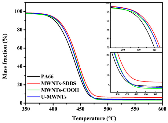 | PA66/MWNTs-SDBS | 416.3 | 7.4 | 409.9 | 445.4 |