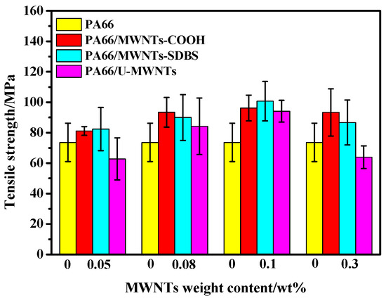 | PA66/MWNTs-SDBS | 0.05 | 0.30(26%) | 82.40(11%) | 27 |