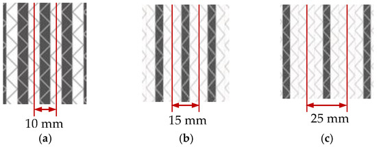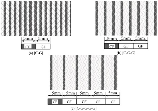 The ratio of span-to-thickness was set to 20, and the width of interlayer hybrid specimens was 13 mm. With regards to intralayer hybrid composites, the specimen width was established at the width of minimum repeating unit presented in Figure 3. In addition, carbon and glass fiber in a specimen should be symmetrically distributed.