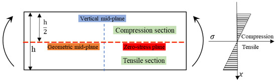According to the force equilibrium equation, as an homogenous composite is subjected to bending loading, the section above the mid-plane is subjected to compressive stress and the section below the mid-plane is subjected to the tensile stress, where the geometric mid-plane and the zero stress plane are coincident [22]. The stress distribution along the vertical mid-plane is shown in Figure 5. It can be found that, with the location along the vertical mid-plane moving from the zero-stress plane to the upper surface and the lower surface, the stress increases linearly, and the sum of the stress in the compression section and the tensile section is zero. The force equation along the vertical mid-plane is shown in the Equation (2). When the composite reaches the bending failure, the bending strength, modulus, and fracture strain can be derived from the Equation (1), since the stress on the upper and lower surface are the same, and the bending strength is the maximum stress on the upper and lower surface.