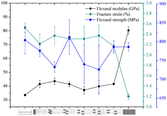 The flexural properties of intralayer hybrid composites with various hybrid ratios and structures were tested in this section, and the results are presented in Figure 16, Figure 17 and Figure 18.