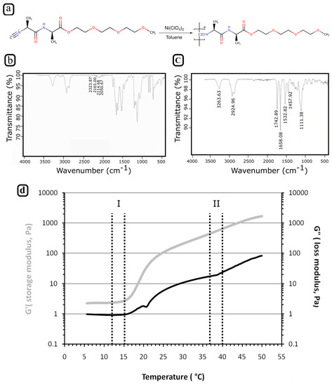 To use PIC effectively as a biocompatible ink, a few main criteria must be addressed. In particular, its gelation point should be below physiological temperatures (being a reverse thermoresponsive hydrogel) and its rheological properties should be suitable for 3D printing. To meet the first feature, a PIC polymer was synthesized from 2-(2-(2-methoxyethoxy)ethoxy)ethyl-(l)-alaninyl-(d)-isocyanoalanine monomers, which should give the polymer a gelation point at around 18 °C [24]. The monomer was polymerized in the presence of Ni(ClO4)2 as a catalyst (Figure 1a). The polymerization was followed by recording the peak at 2142 cm−1 in the IR spectra of the reaction mixture, which corresponds to the isocyanide group of the monomer (Figure 1b). By tracking this peak, the reaction progress could be followed as the isocyanide group of the monomer converted into a secondary ketamine during polymerization. After 4 days of reaction, the isocyanide group peak had completely disappeared (Figure 1c), indicating that the reaction was complete. The PIC hydrogels’ MW was determined, as the stiffness, the solubility, and the gelation characteristics of the PIC hydrogel are all important parameters strongly affected by its MW. The molecular weight was determined using the Mark-Houwink equation, which defines the relationship between viscosity and the MW. This procedure is required to measure the viscosity of solutions at different polymer concentrations. K and α given in Equation (1) were empirically determined [K = 1.4 × 10−9 and α = 0.5714] and are constants for the acetonitrile-PIC system. Based on the determined viscosities, K and α values of the MW were determined to be around 500 kDa.