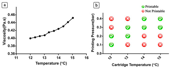 Viscosity and 3D printing parameters of the PIC hydrogels for a range of temperatures. In (a) the effect of temperature over the viscosity of a 5 mg/mL PIC solution is shown while in (b) the printability of PIC solution and the dependence of printing pressure on cartridge temperature are reported.