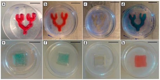 Optical images of 3D embedded constructs that are printed (a,e), covered with GelMA and photocrosslinked (b,f), evacuated (c,g), and perfused with a water-soluble food coloring (d,h) (scale bars: 10 mm).