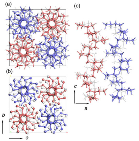 Form II has a tetragonal unit cell packed by 11/3 helix conformation with opposite chirality and a repeating period along the chain axis of 21 Å [24,25,26]. It is recently confirmed to have a space group. As presented in Figure 2, the right- and left-handed helical chains are positioned alternately with the statistical disorderliness about the up- and down-ward directionality [23].