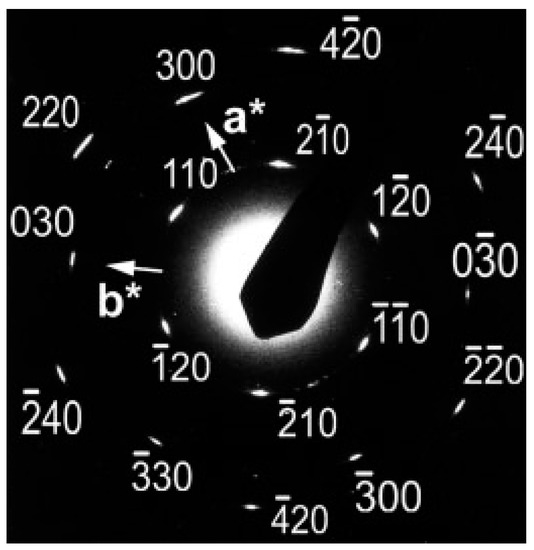 Electron diffraction pattern of an iPBu single flat-on crystal in the trigonal form. The sample was prepared by melting the solution-grown trigonal crystals at 136 °C for 2 min and then crystallized isothermally at 75 °C. Reproduced with permission from Ref. [46], copyright 2007 Wiley Periodicals, Inc.