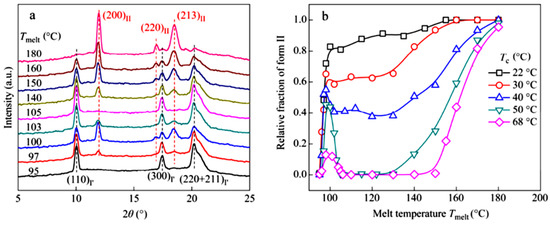 For the second case, when melting the sample at temperatures slightly higher than that needed for self-seeding, even though no pristine crystal fragments survived, there are local domains of aligned chain segments previously included in the crystal lattice as long as an equilibrium melting state is still not reached [64]. This originates from the long chain character of polymers, which results in a temperature-dependent relaxation of the long molecular chains. The entities of aligned chain clusters can easily transform to active nuclei during cooling and influence the subsequent crystallization behavior remarkably, which is generally referred to as the “memory effect”. It can accelerate the crystallization rate, alter the crystalline morphology and influence the selection of polymorph due to the change of free energy for nucleation [65,66,67]. For example, oriented α-iPP fiber can melt-recrystallize into its α or β phase depending on the melting status and recrystallization temperature [68,69,70,71,72]. Men and co-workers have performed detailed studies about the influence of melting status and temperature of subsequent crystallization on the phase selection of an iPBu copolymer [73,74]. It was found that form II has always been obtained after melting at high temperature (e.g., 180 °C) and then crystallized at temperatures lower than 70 °C, independent of the initial crystalline phase. This reflects a complete relaxation of the molecular chains at 180 °C. Consequently, the melt can only crystallize into its form II as generally observed for the crystallization of iPBu homopolymer. The influence of melting temperature on the subsequent crystallization behavior is well illustrated by melting the form I’ crystals at different temperatures before isothermal recrystallization at 50 °C. The ultimate melting temperature of the used form I’ crystals is estimated to be ca. 95 °C. As shown in Figure 9a, the form I’ or II crystallization depends strongly on the melting status. When melting the sample at 95 °C, only form I’ iPBu crystals were obtained. This can be related to the self-seeding process that the residue crystallites acted as nuclei leading to the recrystallization in the same crystalline phase. When melting the sample at 97 °C, besides the characteristic diffraction peaks of form I’ crystals, diffraction peaks related to the form II crystals also appear, indicating the concomitant crystallization of both forms I’ and II. The content of form II crystals increases with further increment of melting temperature to 100 °C. It should be mentioned that form II disappears again when the melting temperature set at 105 °C. Afterwards, the intensity of the form II diffraction peaks increases again with temperature until fully crystallization in form II when melted at 180 °C.