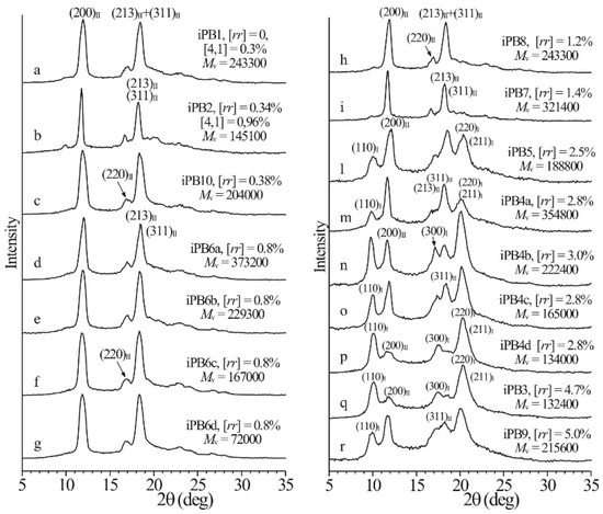The molecular parameters, such as molecular weight, chain architecture, stereoregularity, etc., also exhibit great influence on the polymorphism selection [10,13,14,75,76,77,78,79]. De Rosa et al. [80,81,82] have studied the effect of the molecular weight, stereo- and regiodefects on the polymorphic behavior of melt-crystallized iPB. It was found that the more stereoregular samples with concentration of [rr] stereodefects lower than 1.4 mol %always crystallize into form II structure from the melt regardless of molecular weight (see the X-ray diffraction profiles a–i in Figure 10). On the contrary, the iPB samples with more stereoirregular, e.g., over 2.5 mol % [rr] defects, crystallize from the melt as mixtures of form II and form I (it has been referred to as form I’ in Ref. [80]). In the X-ray diffraction profiles l–r in Figure 10, the content of form I increases with increasing concentration of the defects. This illustrates clearly the influence of stereoirregularity on the polymorph selection of iPBu. Moreover, the [4,1] region-defects affect the polymorphic behavior as well. It should be mentioned here that incorporation of other co-units, i.e., the copolymers, has also great effect on the polymorphic crystallization of iPBu. The influence of few co-units has a close resemblance to the stereo- and regiodefects. If the co-components is long enough for crystallization, then the co-components exhibits a mutual influence on the polymorphic crystallization of each respective phase [73,74,83,84]. Actually, besides the copolymerization, even blending the iPBu with another miscible polymer shows influence on its polymorphic crystallization [85].